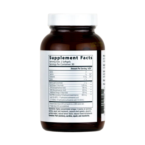 PRM Resolve is formulated with key pro-resolving mediators (PRMs) derived from fractionated marine lipids as well as EPA and DHA, which your body uses to produce SPMs.